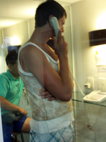 So we made our way back to the Guesthouse and after awhile we got let in. We explained to Marta what had happened and apologized for losing our second pair of keys. She was understanding but also a little worried because that was the only key to Tony and my room. So until a locksmith could come all of our stuff was held captive inside the room. But we had other things on our minds, like the fact that our credit card, with all of our travel funds, was in the hands of some Brazilian thief. So in nothing but our bathing suits we made our way to a cabina, where we could call the bank and cancel the card. Unfortunately, the cabina we chose had a very strict “no shirt, no shoes… do not even think of coming in here” policy. We tried to explain to them that Tony’s shirt had just been stolen and we did not have access to any other clothes at that moment, but they were not having it. We stepped outside and shook our fists in their general direction. Then as any loving Mom would do, Peggy offered Tony her over shirt, and he graciously excepted. So with his new styling lace tank top Tony strode back into the cabina and asked politely for a phone. After quite awhile on the phone explaining our situation to the costumer service specialists at Washington Mutual they proposed to have a new card sent to the Guesthouse and explained it would arrive in meager two days. We were impressed!! So with the card cancelled and a new one on the way our worries were alleviated and Peggy decided it would probably be a good idea to get Tony out of her lace tank top and into a new shirt and pair of pants. So she took him shopping.
