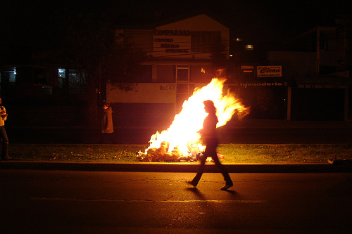 Can't see the movie? Click here to download Quicktime Wow! New Years in Ecuador is really something else... We observed some pretty amazing traditions held unique to Ecuador. And were extremely pleased to have attended a "Burning Man"-type event! The days leading up to December 31st have the Quito streets filled with vendors of Año Viejos (old years). These are doll-like men stuffed with wood chips and wearing a plethora of different masks. As history goes, these signified the husbands of the Viudas (widows), who were actually males, and would dress in all black and go to the streets to ask for money. At Midnight, everyone burns their Año Viejos and release the old year.